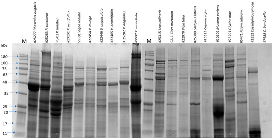 SDS-PAGE profile of crude extracts of different pulse proteins from family Fabaceae. ‘M’ indicates protein molecular standards, and kDa indicates the molecular weight of kilodaltons.