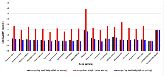 The average weight of seeds before soaking, after soaking, and dried post-soaking of 21 samples after a soaking time of 15 h.