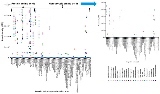 Forty-seven free NPAAs and twenty free PAAs were identified across various legume samples in this study. Most NPAAs (26/45) were definitively identified based on accurate mass spectrum, retention time, and MS-MS fragment ions. While reference standards were unavailable for the remaining 21 NPAAs, they were tentatively identified based on accurate mass spectra and fragment ions. Most samples contained all 20 PAAs. All 22 species showed the presence of GABA and α-aminoadipic acid. Nineteen of twenty-two species contained γ-glutamyl-phenyl-L-alanine, while eighteen contained pipecolic acid, and sixteen contained γ-glutamyl-leucine and S-methyl-L-cysteine. Fifteen samples showed the presence of γ-acetyl-L-ornithine. Fourteen contained γ-glutamyl-S-methyl cysteine, and nine contained homoserine. Other compounds were detected in fewer samples (Table 4).