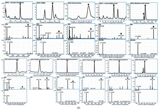 Derivatized amino acids showed predominantly the fragment ions (m/z 171.0553, 145.0760) associated with the derivatization agent while also showing ions similar to those seen with underivatized or native amino acid fragment ions, i.e., fragment ions of the amino acid backbone (Table 3). Amino acids containing sulfur, such as methionine and cysteine, exhibited losses of ammonia (17 Da, NH3), water (18 Da, H2O), carbon monoxide (CO), ethanimine (C2H5N), and methyl thiol (CH3SH). Branched-chain amino acids or hydrophobic compounds like leucine, isoleucine, and valine showed sequential losses of H2O, CO, and NH3. Similarly, protonated aromatic amino acids, such as tryptophan, phenylalanine, and tyrosine, demonstrated losses of CH2CO, CO2, NH3, H2O+CO, HCN, CH3, H2O, and CO. Polar uncharged amino acids, including glutamine, asparagine, threonine, and serine, showed losses of NH3, H2O+CO, and H2O. The observed fragment losses for the negatively charged side chains, such as those in glutamic and aspartic acid, included H2O and H2O+CO. Positively charged amino acids, including histidine, arginine, lysine, and ornithine, showed losses of H2O+CO, NH3, CO2, or combinations thereof. While most amino acids fragmented uniquely, some structurally similar amino acids produced common fragment ions [28,29]. Similar patterns of fragmentation were observed for NPAAs (Table 3). Extracted ion chromatograms (EIC) for each analyte with mass spectrometry information in MS and MS/MS modes for free PAAs and NPAAs are presented in Figure S2.