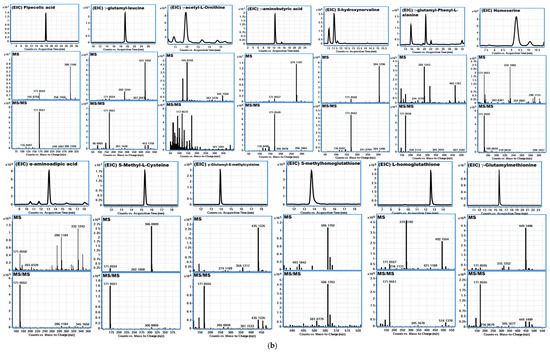 Extracted ion chromatograms (EIC) for each analyte with mass spectrometry information in MS and MS-MS modes of (a) C. spinosa (tara) seed powder samples; (b) P. vulgaris (common bean) soaked seed samples.