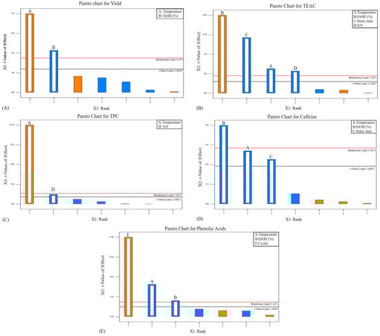 The Pareto charts (Figure 2) highlight the relative impact of the extraction parameters on the measured responses, with bar lengths indicating effect magnitude and Bonferroni and t-value limits marking statistical significance thresholds. Parameters exceeding these thresholds are critical to the extraction process. For EY (Figure 2A), temperature and ethanol concentration are the most influential, enhancing solvent penetration and cell wall disruption. The TEAC (Figure 2B) is primarily driven by the ethanol concentration and static time, optimizing solubilization and bioactive recovery. The TPC (Figure 2C) is dominated by temperature, while the caffeine content (Figure 2D) depends on the ethanol concentration, temperature, and static time for improved solubility and mass transfer. In terms of the phenolic acid content (Figure 2E), the number of extraction cycles is most significant, alongside the temperature and ethanol concentration.