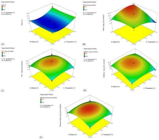 Response surface plot for: (A) extraction yield, (B) TEAC, (C) TPC, (D) caffeine, and (E) phenolic acids.