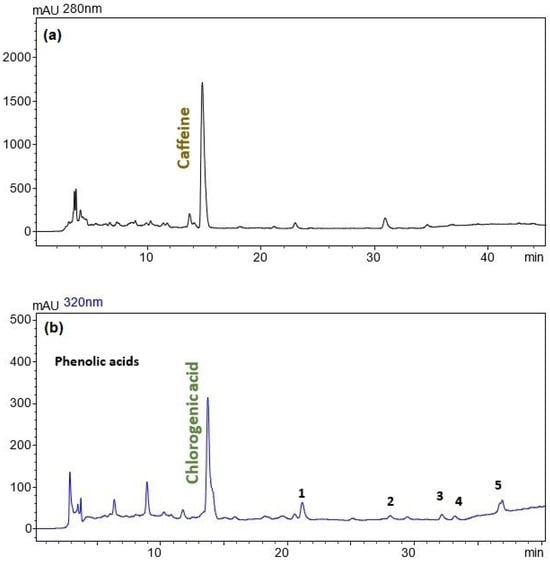 HPLC analysis of coffee silverskin extracts obtained under the optimized extraction conditions: (a) caffeine detection at 280 nm and (b) phenolic acid detection at 320 nm. Peaks 1–5 represent additional detected phenolic acids.