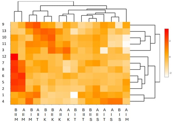 Scaled heat map for the grain of four genotypes of winter wheat in terms of the content of PAs. Explanations: Y-axis (Y) phenolic acids, PAs: 1—4-OH-benzoic acid. 2—caffeic acid. 3—OH-benzoic acid. 4—syringic acid. 5—p-coumaric acid. 6—o-coumaric acid. 7—ferulic acid. 8—sinapic acid. 9—di-ferulic acid isomer I. 10—di-ferulic acid isomer II. 11—di-ferulic acid isomer III. 12—di-ferulic acidisomer IV. 13—di-ferulic acid isomer V. X-axis, first row: Level of cultivation technology: A—medium level of cultivation technology. B—high level of cultivation technology. X-axis, second row: crop years: I—2011/2012. II—2012/2013. X-axis, third row: Genotype: M—T. monococcum PL 5003. T—T. aestivum ssp. vulgare ‘Tonacja’. S—T. aestivum ssp. spelta ‘Schwabenkorn’. K—T. turgidum ssp. durum ‘Komnata’.