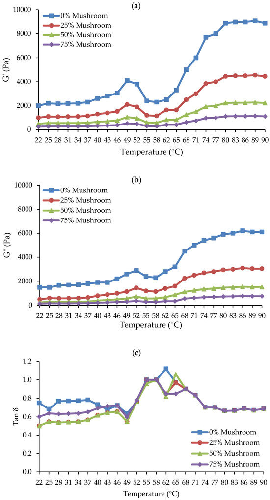 In meat gels, viscoelastic attributes include elasticity and viscosity. Elasticity and viscosity are important rheological parameters that help to understand the structure and behavior of the gel matrix [37]. The elastic modulus (G′), also known as the storage modulus, is a measure of the gel’s solid-like or elastic properties, which represent its ability to store energy when deformed. This increases the gel’s hardness or elasticity. The viscous modulus (G″), also known as the loss modulus, assesses the gel’s liquid-like or viscous properties, indicating its ability to dissipate energy during deformation and is related to flow characteristics or slipperiness [38]. Mushrooms are high in proteins and polysaccharides, which can affect both G′ and G″ when added to meat products in various forms (fresh, powder, or processed), depending on their concentration [14]. Figure 3a–c shows how varying concentrations of SGM powder (0, 25, 50, and 75%) affect the dynamic rheological parameters (G′, G″, and tan δ) of Ligor chicken gel, also known as chicken-mushroom hybrid gels, when heated from 22 °C to 90 °C.