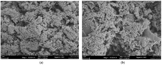 A scanning electron microscope (SEM) (Gemini SEM, Carl Ziess Microscopy, Oberkochen, Germany) was used to examine the microstructures of gels at a 10 KV acceleration voltage [13,36]. Briefly, the gel samples were cut into cubes (3 × 3 × 3 mm3) and washed using a phosphate buffer solution (0.2 M, pH 7.0) to eliminate dust and impurities from the sample surface. The washed samples were then fixed using a 2.5% glutaraldehyde solution for 10 h. The fixed samples were washed three times with the same buffer, dehydrated using 30, 50, 70, and 90% ethanol solutions, and then dehydrated three times in 100% ethanol; each dehydration step was performed for 10 min. The dried gel samples were treated three times with tert-butyl alcohol for 15 min each. Finally, the gel samples were mounted on a sample table and coated with 10 nm gold film using an ion sputtering apparatus (SC100, Hitachi, Tokyo, Japan).