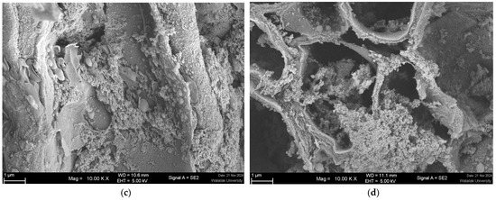 To better understand the textural changes in gels caused by replacing chicken meat with SGM powder, the gels’ microstructure was documented using SEM (Figure 4a–d). The protein-protein interactions are primarily responsible for heat-induced gelation. Exogenous additives may improve or impede the gelling characteristics of myofibrillar proteins, depending on their ability to produce composite gel and modify intermolecular interactions [61]. The gels incorporated with SGM powder at various concentrations (0, 25, 50, and 75%) showed considerably diverse microstructures, with a propensity toward macropore architectures when SGM powder was applied. Furthermore, the creation of holes on gel structures increased proportionally with increasing SGM powder concentrations. It was observed that the control gel had a dense and compact matrix, which is typical of gels with limited macropore structure. The addition of 25% SGM powder resulted in a hybrid gel with higher porosity and small, evenly dispersed macropores. With 50% SGM powder, the hybrid gel had substantially larger and more numerous macropores, but the hybrid gel with 75% SGM powder exhibited excessive porosity, irregular and larger macropores, and void space.