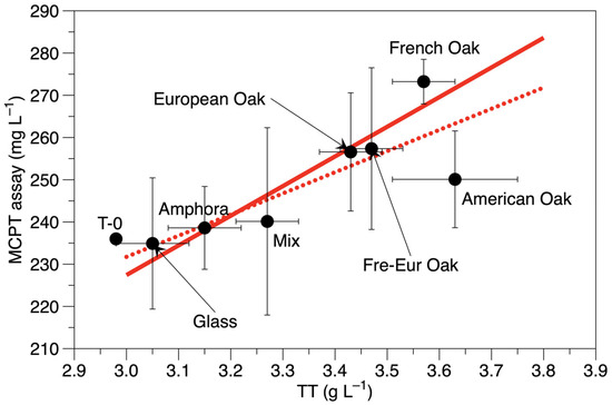 Linear regressions of TT (total tannins) concentration (g L−1) and MCPT assay results (mg L−1).