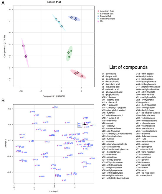 Partial least squares discriminant analysis (PLS-DA) of the volatile compounds in Negroamaro wine aged in different wooden barrels. (A) Scores plot with 95% confidence regions. (B) Loading plot of the variables. Abbreviations for volatile names: 2-m-1-propanol (2-methyl-1-propanol); PEA (phenylethyl alcohol); 3-MND (3-methyl-2,4-nonanedione); 2-AAP (2-aminoacetophenone); ethyl 3-hydroxybutyrate (et-3-OH-but); m-anthranilate (methyl anthranilate); TDN (1,1,5-trimethyl-1,2-dihydronaphthalene).