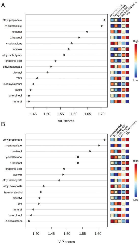 Partial least squares discriminant analysis (PLS-DA) of the volatile compounds in Negroamaro wine aged in different wooden barrels. (A) Most important variables in the model according to VIP score for component 1. (B) Most important variables in the model according to VIP score for component 2 (the colored boxes on the right indicate the relative concentrations of the corresponding metabolite in each group under study). Abbreviations for volatile names: 2-m-1-propanol (2-methyl-1-propanol); PEA (phenylethyl alcohol); 3-MND (3-methyl-2,4-nonanedione); 2-AAP (2-aminoacetophenone); ethyl 3-hydroxybutyrate (et-3-OH-but); m-anthranilate (methyl anthranilate); TDN (1,1,5-trimethyl-1,2-dihydronaphthalene).