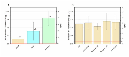 3-methyl-nonanedione concentration in samples aged in wood, glass and amphorae (A); 3-methyl-nonanedione concentration in samples aged in different types of barrels (B). Different letters mean significant differences at p < 0.05. The red line indicates the concentration of the compound before ageing (T0).