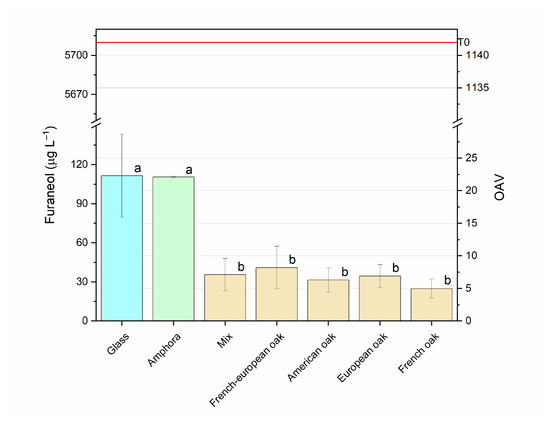 Furaneol concentrations (mean ± S.D.) in Negroamaro wine aged in different materials (glass, amphora, mixed, French oak, European oak, American oak, Fre–Eur oak). Different letters mean significant differences at p < 0.05. The red line indicates the concentration of the compound before ageing (T0).
