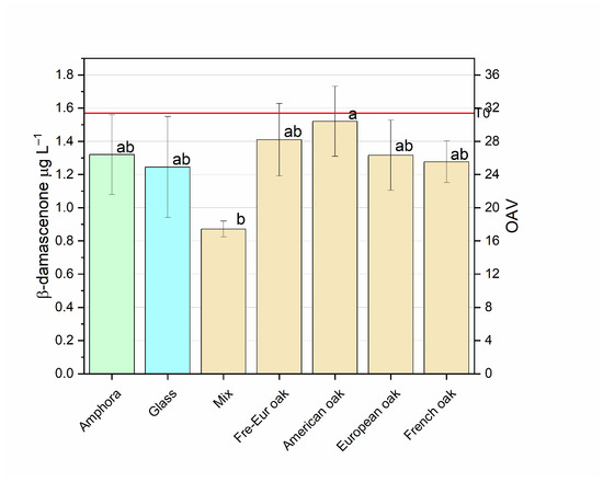 β-damascenone concentrations (mean ± S.D.) in Negroamaro wine aged in different materials (glass, amphora, mixed, French oak, European oak, American oak, Fre-Eur oak). Different letters mean significant differences at p < 0.05. The red line indicates the concentration of the compound before ageing (T0).