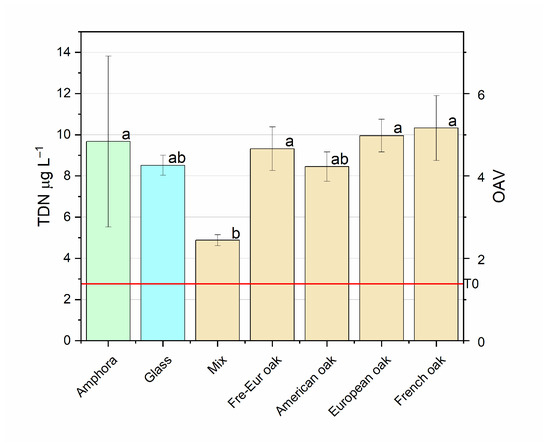 TDN (1,1,5-trimethyl-1,2-dihydronaphthalene) concentrations (mean ± S.D.) in Negroamaro wine aged in different materials (glass, amphora, mixed, French oak, European oak, American oak, Fre-Eur oak). Different letters mean significant differences at p < 0.05. The red line indicates the concentration of the compound before ageing (T0).