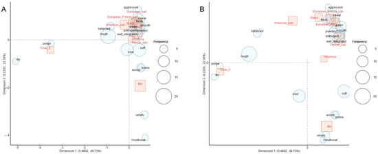 Correspondence analysis of the aroma attributes of the Negroamaro wine before ageing (T-0) and after ageing in different materials (glass, amphora, mixed, French oak, European oak, American oak, Fre-Eur oak). (A) Original scale map; (B) map with the “enlarge the area near origin” function (3×). Red squares correspond to wines and blue bubbles correspond to taste attributes. Size of bubbles represents term frequency.