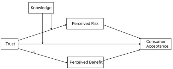 Beyond trust, consumers as rational economic agents evaluate the potential benefits and risks associated with products before making purchase decisions. Consequently, perceived benefits and perceived risks act as mediating factors between consumer trust and purchase intentions [19,20]. Wang et al. [21] have also discussed the role of consumer knowledge in shaping consumer trust. Amarullah et al. [22] demonstrated that consumer knowledge moderates the relationship between trust and purchase intention. Furthermore, some studies have examined how knowledge moderates the relationship between consumer perception and purchase intention [23].