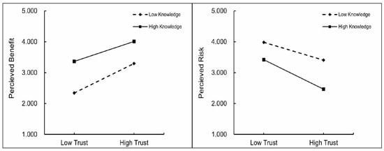 Table 7 shows that perceived benefits among high-knowledge consumers exhibit less variation with increasing trust than among low-knowledge consumers. This outcome illustrates the negative moderating effect of knowledge on the trust–perceived benefit relationship. Regarding the moderating effect of knowledge on trust and perceived risk, high-knowledge consumers experience a greater reduction in perceived risk with increased trust than low-knowledge consumers. In the low-knowledge group, the moderating effect of knowledge on the trust–perceived risk relationship is smaller than in the high-knowledge group.