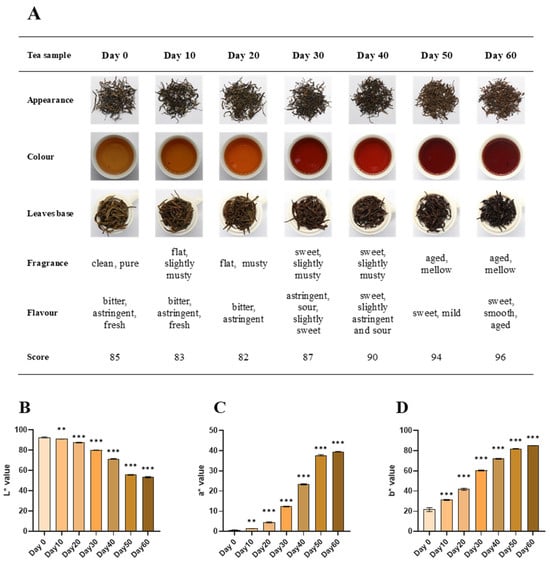Quality characteristics of tea samples. (A) Sensory quality evaluation results, including five aspects of tea (appearance of tea leaves and leaf base, color, aroma, and taste of tea infusion) and overall scores. (B) L* values of tea infusions. (C) a* values of tea infusions. (D) b* values of tea infusions. Compared to Day 0, **: p < 0.01, ***: p < 0.001.