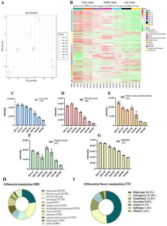 A total of 532 metabolites were annotated based on the metabolic database (Table S1). To understand the effect of PF duration on the type and content of tea metabolites, the metabolites were classified into 11 subsets, including flavonoids (155), phenolic acids (98), amino acids and derivatives (56), lipids (50), organic acids (43), nucleotides and derivatives (43), tannins (21), alkaloids (12), lignans and coumarins (7), terpenoids (4), and others (43). The clustering heat map (Figure 2B) revealed the changes in the contents of various metabolites during the PF process. Compared to Day 0, flavonoids and ellagitannins both consistently decreased with longer PF duration. Most phenolic acids reached their highest levels at Day 0, with some increasing abruptly at Day 20, but the majority continued to decrease in the last two PF stages. Amino acids and their derivatives, and organic acids followed an overall trend of first rising and then falling. Most amino acids, derivatives, and organic acids peaked on Day 30. Most alkaloids peaked on Day 0 and decreased as the PF duration progressed, while some showed opposite trends. The contents of nucleotides and their derivatives, and terpenoids almost continuously increased throughout the PF duration. The taste of tea infusion is usually associated with the levels of flavonoids, phenolic acids, amino acids, organic acids, and alkaloids [21]. Peak area intensities (Figure 2C–G) showed that the total levels of flavonoids, phenolic acids, amino acids, organic acids, and alkaloids on Day 60 were 24.7%, 10.3%, 12.7%, 21.0%, and 44.2% of Day 0, respectively. Therefore, among all 532 metabolites, flavonoids, phenolic acids, amino acids and their derivatives, and organic acids were more abundant and significantly decreased with the prolongation of the PF duration, which might contribute more to the taste changes in the PF process.