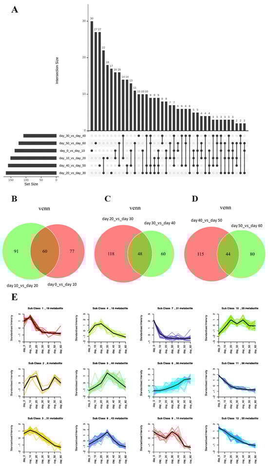 Profiles of differential metabolites. (A) Upset plot for overall layout of differential metabolites during PF process. (B) Venn diagram of differential metabolites during the early stage. (C) Venn diagram of differential metabolites during the middle stage. (D) Venn diagram of differential metabolites during the late stage. (E) K-means cluster plots of differential metabolites.