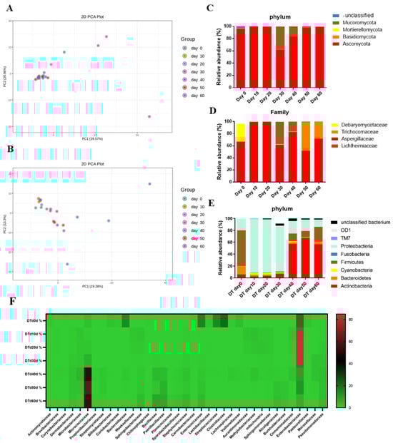 Comparison of microbial community structures. (A) PCA of fungi. (B) PCA of bacteria. (C) Relative abundance column cumulative plots of fungi at the phylum level. (D) Relative abundance column cumulative plots of fungi at the family level. (E) Relative abundance column cumulative plot of bacteria at the phylum level. (F) Relative abundance heat map of bacteria at the family level.