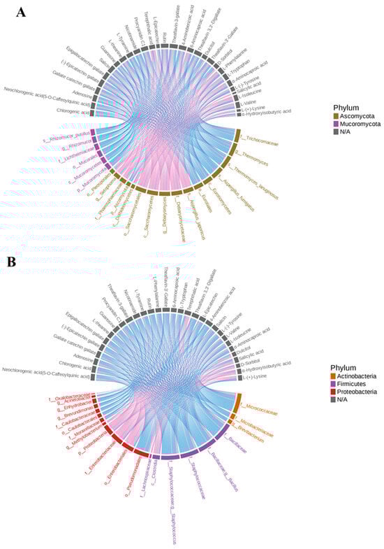 Correlation analysis of microbial communities and 31 significantly differential taste metabolites. (A) Correlation chord chart of fungi. (B) Correlation chord chart of bacteria. Pink color indicates positive correlation, blue color indicates negative correlation.
