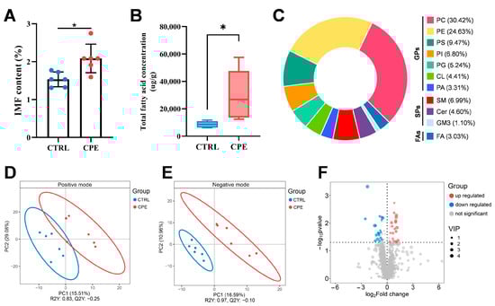 Effect of composite plant extracts (CPE) supplementation on lipid characteristics of the Longissimus dorsi muscle (LDM) in sheep (n = 6). (A) Intramuscular fat (IMF), expressed as means ± standard deviation. (B) Total fatty acid concentration, box plots with median (inside horizontal line), 25th and 75th percentiles (lower and upper edges of the boxes, respectively), minimum and maximum (lower and upper lines outside the boxes) values. (C) Percentage of lipid subclasses for pooled two groups. (D) Partial least squares discriminant analysis (PLS-DA) score spots in positive iron mode. (E) PLS-DA score spots in negative iron mode. (F) The volcano plot showed all lipid molecules detected from the CTRL and CPE groups, with differentially upregulated and downregulated lipid molecules highlighted in red and blue, respectively. * p < 0.05. CTRL, fed a basal diet. CPE, fed the basal diet supplemented with CPE. GPs: glycerophospholipids. SPs: sphingolipids. FAs: fatty acyls. PC: phosphatidylcholines. PE: phosphatidylethanolamines. PS: phosphatidylserines. PI: phosphatidylinositol. PG: phosphatidylglycerol. CL: cardiolipins. PA: phosphatidic acids. SM: sphingomyelin. Cer: ceramide. GM3: acidic glycosphingolipids. FA: fatty acids and conjugates.
