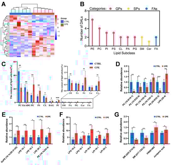 To further examine the effects of CPE on the lipid profile of LDM, DALs were identified according to the criteria mentioned previously. A comparison between the CTRL and CPE groups revealed 38 DALs (Figure 1F), with the CPE group exhibiting 19 upregulated and 19 downregulated DALs, as illustrated in Figure 2A. Of these 38 DALs, 27 lipid molecules were classified as GPs, SPs, and FAs, specifically with 22 as GPs, three as SPs, and one as FAs, while 11 remained unclassified (Figure 2B). Within the DALs, the relative contents of PCs and GlcADG were observed notably lower in the CPE group compared to the CTRL group (Figure 2C,D). Conversely, PEs, PSs, and PIs levels displayed higher in the CPE group than the CTRL group (Figure 2C,F). Furthermore, our findings revealed significantly low relative contents of SM (d25:2/14:0) and SM (d17:1/24:2), which belong to the SPs category, in the LDM of the CTRL group (Figure 2G).