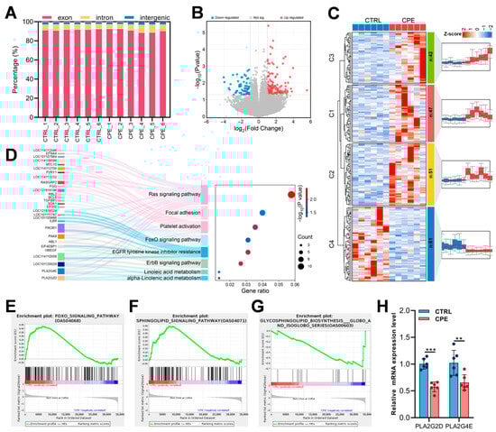 To explore the gene expression profile of LDMs after CPE supplementation, RNA sequencing was performed on LDM samples from both CTRL and CPE groups (n = 6). This generated 82.03 Gb of raw data across 12 libraries, with at least 92.07% of the reads achieving quality scores of Q30 or higher (Table 4). On average, 90.44% of clean reads uniquely mapped to the reference genome (Table A2). In the annotation files for sequences that aligned uniquely, 91.53%, 5.73%, and 2.74% of reads aligned to exon, intron, and intergenic regions, respectively, per sample (Figure 3A). A total of 201 differentially expressed genes (DEGs) were identified, with 140 upregulated and 61 downregulated genes in the CPE group (Figure 3B). Cluster analysis revealed four gene clusters with distinct expression patterns between CTRL and CPE groups (Figure 3C). Specifically, DEGs in C1 (n = 47), C2 (n = 51), and C3 (n = 42) exhibited elevated expressions in the CPE group, while DEGs in C4 (n = 61) tended to be more highly expressed in the CTRL group.