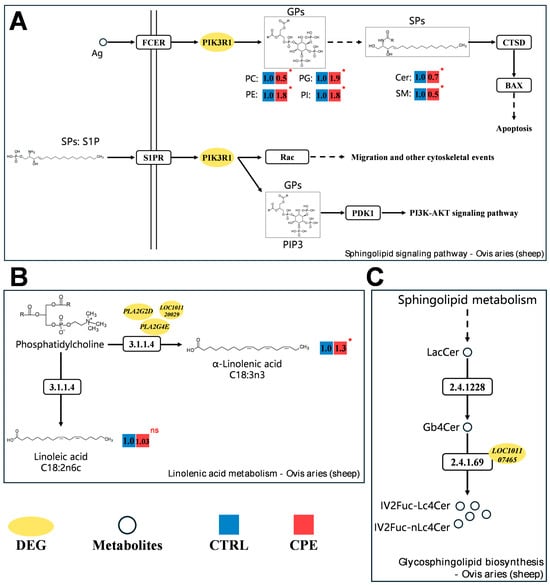 Proposed regulatory network involving relevant metabolic pathways in Longissimus dorsi muscle (LDM) after composite plant extracts (CPE) addition. (A) Sphingolipid signaling pathway. (B) Linolenic acid metabolism. (C) Glycosphingolipid biosynthesis. The yellow ovals indicate DEGs. Blue and red boxes represent CTRL and CPE groups, respectively, and the numbers above indicate the relative expression of lipid molecules. * p < 0.05, ns indicates no significant difference.