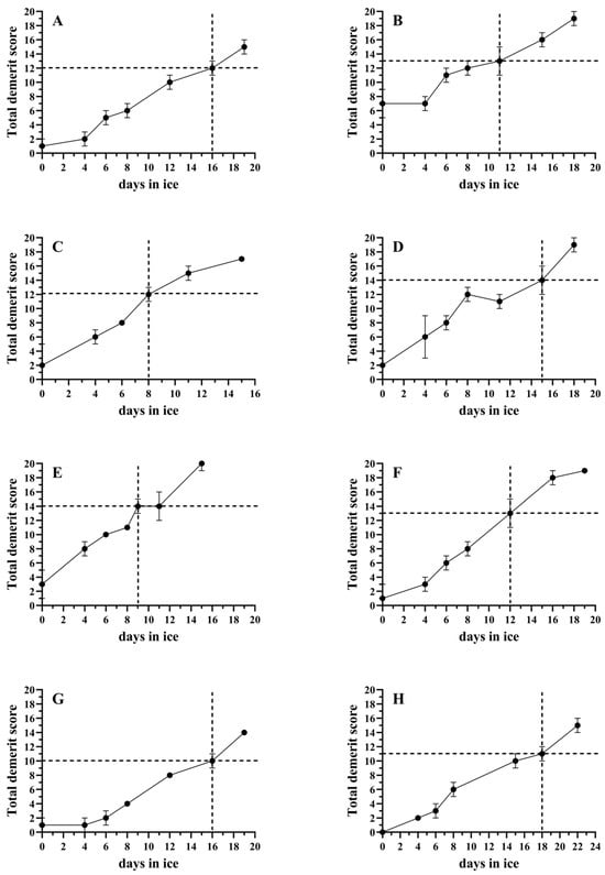 QIM sensory freshness evaluations of the studied species during ice storage. (A) Barramundi, (B) cobia, (C) coral trout, (D) giant trevally, (E) milkfish, (F) mangrove red snapper, (G) snubnose pompano and (H) sobaity bream. The vertical dotted line in the diagrams marks the acceptability limit (in days), while the dotted horizontal line indicates the QIM score that the fish received at this point. The bars indicate the standard deviations (n = 3).