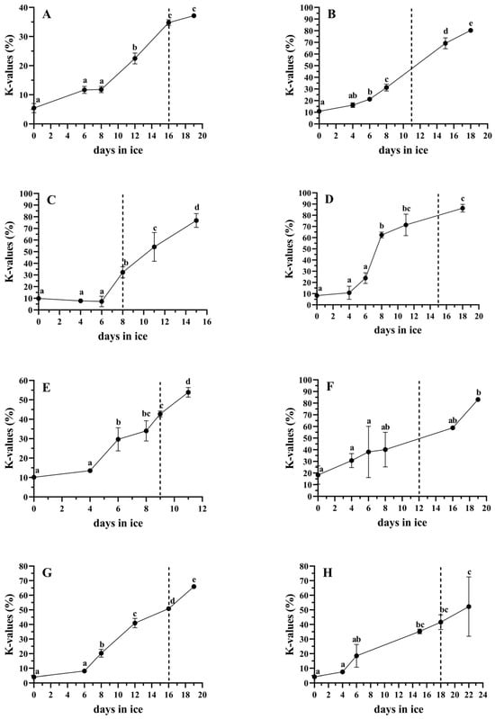 K value changes during ice storage of (A) barramundi, (B) cobia, (C) coral trout, (D) giant trevally, (E) milkfish, (F) mangrove red snapper, (G) snubnose pompano and (H) sobaity bream. The dotted line represents the day that the acceptability limit was reached (end of shelf life). Different letters represent statistically significant differences (p < 0.05). The bars represent the standard deviations (n = 3).