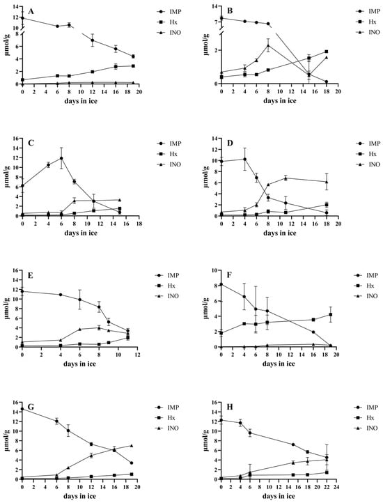 IMP, Ino and Hx concentrations of the studied species during ice storage. (A) Barramundi, (B) cobia, (C) coral trout, (D) giant trevally, (E) milkfish, (F) mangrove red snapper, (G) snubnose pompano and (H) sobaity bream. The bars represent the standard deviations (n = 3).