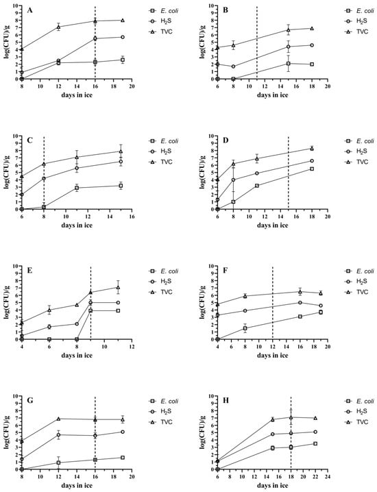 Microbial spoilage of (A) barramundi, (B) cobia, (C) coral trout, (D) giant trevally, (E) milkfish, (F) mangrove red snapper, (G) snubnose pompano and (H) sobaity bream during ice storage. TVC (△), H2S-producing bacteria (◯) and E. coli (◻). The dotted line represents the day that the acceptability limit was reached (end of shelf life). The bars represent the standard deviations (n = 3).