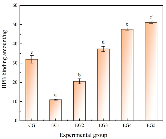 BPB is bromophenol blue, which is a pH indicator, and its ability to bind to proteins can reflect the surface hydrophobicity of proteins. Surface hydrophobicity can reflect the distribution of hydrophobic amino acids on the surface of proteins, which is closely related to the functional properties of proteins. Before the experiment, the beef mince was removed from the refrigerator and kept at room temperature for 30 min until it completely softened. As shown in Figure 1, the surface hydrophobicity of the emulsion gel fat substitute gradually increased with the increase in the proportion of emulsion gel; there were significant differences between the groups (p < 0.05). The surface hydrophobicity of the CG was 31.98 μg, and EG3 was similar to that of tallow; when the proportion of fat substituted by the emulsion gel reached 50%, the surface hydrophobicity of the beef mince attained a value of 37.34 μg. The emulsifying properties of proteins could be improved by appropriately changing the surface hydrophobicity of proteins, because the exposure of hydrophobic groups in proteins increased the interaction between proteins and oils, promoted the adsorption of proteins by oils, and formed dense and stable protein membranes. This is conducive to increasing the emulsifying properties [29,30,31]. However, the increase in surface hydrophobicity will lead to a decrease in protein stability and weakened protein–water interaction. The protein is prone to hydrophobic aggregation and protein denaturation, which is not conducive to the formation of a gel network structure [32,33].