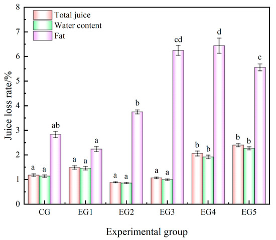 Effect of adding different amounts of emulsion gel on juice loss of beef mince. Note: Different letters indicate that there are significant differences between experimental groups (p < 0.05).