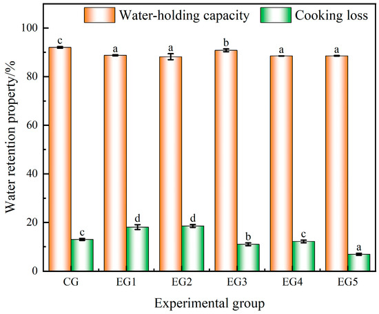 Water retention and cooking loss of beef minced with different amounts of emulsion gel. Note: Different letters indicate that there are significant differences between experimental groups (p < 0.05).