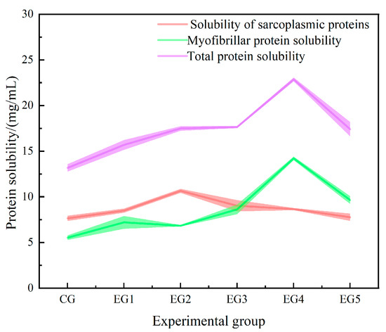 Solubility is mediated by non-covalent interactions (e.g., electrostatic forces, hydrophobic interactions, hydrogen bonds) and is considered the major characteristic of proteins that are selected for use in food [40]. As depicted in Figure 4, the progressive augmentation of emulsion gel addition exhibits a biphasic effect on overall protein solubility, initially eliciting an increase, followed by a decline. When the replacement of fat with emulsion gel was increased to 75%, the protein solubility reached the highest point of 22.85 mg/mL. Notably, the myofibrillar protein solubility attained its peak value of 14.20 mg/mL in EG4. This phenomenon might be due to the fact that, with the increase in the gel content of the emulsion, the salt ion content increases, reducing the repulsion force between protein molecules by harnessing the full potential of surfactants; oil droplets were more effectively adsorbed onto their surfaces, leading to an improvement in emulsification efficiency. In EG5, a slight decline in protein solubility was observed. This reduction can be ascribed to the protein condensation that occurred when the ionic strength increased beyond a critical threshold, ultimately resulting in decreased solubility. Several studies have revealed that an augmentation in the quantity of salt added results in an elevation in the salt-soluble protein content within the meat paste. Specifically, a significant amount of myosin or actin becomes adsorbed onto the surface of fat particles, forming a dense protein layer that subsequently enhances the emulsion stability of the sample [41]. In conclusion, the protein solubility of the beef meat paste system achieves its maximum level, and the emulsion stability is optimized, when the proportion of fat substituted by emulsion gel reaches 75%. The emulsifying properties of beef mince could be improved to some extent by using the Chinese-yam-based emulsion gel as a fat substitute.