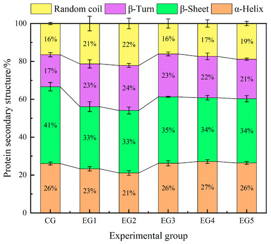 In Figure 5, the proportions of α-helix, β-sheet, β-turn, and random coil are displayed. The relative abundance of α-helix and β-sheet configurations constitute the secondary structural features of a well-ordered and stable protein. Figure 5 shows that with the increase in emulsion gel addition, the α-helix content first decreases and then increases. Specifically, the α-helix contents of EG1 and EG2 were lower than those of the other groups. Within the context of protein architecture, the α-helix is recognized as the most robust spiral conformation, primarily stabilized by hydrogen bonding interactions. Concurrently, β-sheet and β-turn are also related to hydrogen bonding. As the proportion of emulsion gel increased, there was a concomitant elevation in both protein and polysaccharide quantities. Notably, an increase in β-sheet and β-turn structures implies the formation of hydrogen bonds between the proteins and anionic polysaccharides [42]. Furthermore, the augmentation in the α-helix content suggests that the incorporation of emulsion gel served to transition the meat mince system from a disordered to an ordered state.