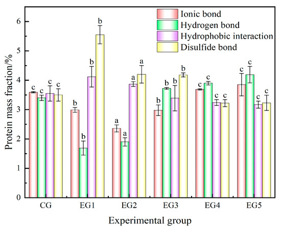 Ionic and hydrogen bonds constitute the primary natural structures that are instrumental in maintaining the stability of proteins [44]. During the formation of minced meat gels, the initial step involves the disruption of ionic bonds by salt ions, facilitating the dispersion of proteins. Subsequent heating then induces protein denaturation and aggregation, ultimately leading to gel formation. The analysis in Figure 6 shows that there is no significant difference in the ion bond content between the CG and EG4 and EG5 (p > 0.05). However, the ion bond content of the CG is significantly higher than that of EG1, EG2, and EG3 (p < 0.05). So, the structures of the CG, EG4, and EG5 are relatively stable.