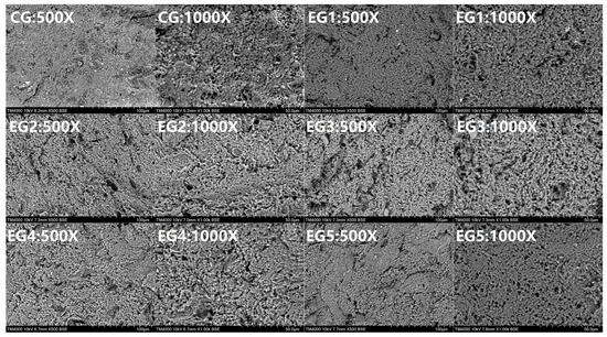 As depicted in Figure 7, the incremental addition of emulsion gel exhibits a notable influence on the microstructural alterations of beef mince. Specifically, the gel formed within the CG exhibits a coarse structure and uneven texture, whereas the gel in EG1 displays a relatively dense consistency, resulting in the formation of small pores. EG2, EG3, EG4, and EG5 differ in the amount of emulsion gel added. It is evident that as the amount of emulsion gel increases, the gel structure becomes progressively more compact, with pores that are relatively small, regular, and uniformly distributed. This phenomenon could be attributed to the non-flowable nature and high viscosity of the emulsion gel, which, upon grinding, facilitates its effective dispersion within the meat paste system, thereby enhancing the compactness and uniformity of the gel structure [50]. In comparison to the CG, the incorporation of emulsion gels significantly refines the gel structure of beef mince, rendering it more regular and compact.