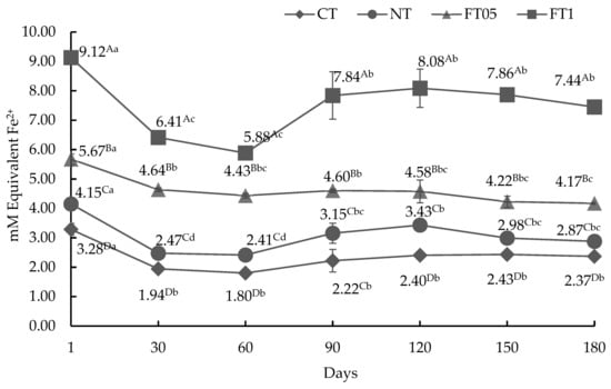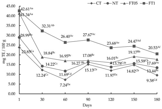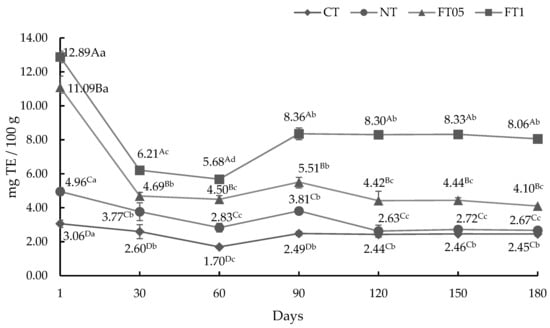 The ABTS assay quantifies the ability of antioxidants to neutralize the ABTS cation radical, a blue–green chromophore exhibiting peak absorption at 734 nm, whose strength diminishes in the presence of antioxidants [36]. Differences were found (p < 0.05) between treatments (p < 0.05) and over time (Figure 1). The highest AA was observed at day 1 (p < 0.05) in FT05 and FT1. After 180 days of shelf life, FT1 (20.53 mg TE/100 g) and FT05 (17.69 mg TE/100 g) presented the highest AA (p < 0.05).