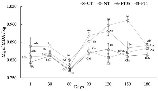 The predominant technique for assessing oxidation involves quantifying the oxidized malondialdehyde (MDA) in meat and meat products [48]. MDA is a primary product of lipid oxidation and is linked to the formation of unpleasant scents in meat. [49]. The oxidation results are shown in Figure 4. The four treatments showed similar behavior during their shelf life, where FT05 and FT1 presented the lowest values and CT and NT the largest (p < 0.05).