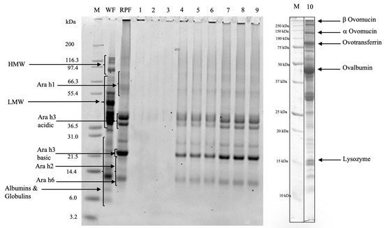 Electrophoretic separation of wheat flour, roasted peanut flour, and muffin total proteins. M: protein marker; WF: wheat flour; RPF: roasted peanut flour; Profiles (1-2-3): control muffins; Profiles (4-5-6): 4% peanut muffins; Profiles (7-8-9): 20% peanut muffins; and Profile 10: egg total proteins.