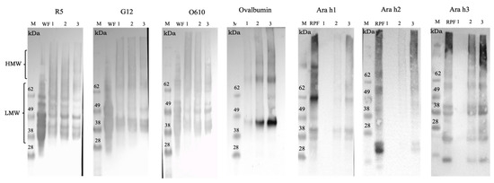 Western blot of muffin samples. M: protein marker; WF: wheat flour; RPF: roasted peanut flour; Profile 1: control muffins; Profile 2: 4% peanut muffins; and Profile 3: 20% peanut muffins analyzed using the R5, G12, and O610 antibodies and against ovalbumin, Ara h1, Ara h2, and Ara h3.