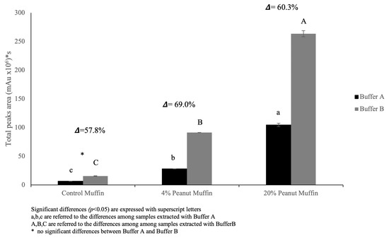 The molecular weight protein distribution of the starting raw materials, control muffin, 4% peanut muffin, and 20% peanut muffin was assessed by the application of the two-step extraction procedure described by Gupta et al. [23] and Rutigliano et al. [22], testing the efficiency of two extraction buffers: the one described by the original method (Buffer A) [23] was compared with a second buffer (Buffer B), which was obtained considering the addition of denaturing (2 mol L−1 Urea) and reducing (1.5% (w/v) Dithiothreitol, DTT) agents [22]. The “SDS-extractable polymeric proteins” (SDS-EPs) and the “SDS-Unextractable polymeric proteins” (SDS-UPs), i.e., proteins extractable with the aid of sonication, were assessed.