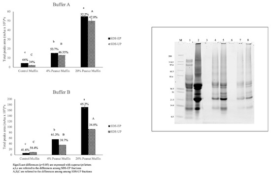 The percentage difference (Δ) calculated between the two buffers was lower in the control muffin (Δ = 57.8%) than in the other samples, namely Δ = 69.0% for the 4% peanut muffin and Δ = 60.3% for the 20% peanut muffin. These results were consistent with those obtained from the electrophoretic analysis (Figure 1), where the protein patterns were revealed especially in the samples employing roasted peanut flour, while they were barely visible for the control sample due to a very low extraction efficiency, probably because of the high rate of aggregation caused by the presence of eggs in the formulation. On this matter, it was noteworthy that both the electrophoretic patterns and the chromatographic profiles of the control muffins suggested the possible formation of a complex food structure, characterized by the presence of sulfur-containing amino acids and egg protein coagulation, which may have resulted in a negligible extraction capacity for the whole protein pattern. The different percentages of extraction of the SDS-extractable (SDS-EP) and SDS-unextractable (SDS-UP) portions are reported in Figure 5, comparing Buffer A and Buffer B. Once again, it is possible to underline how the total peak area detected for the samples extracted with Buffer B was higher (200 × 106 mAu * s) than with Buffer A (60 × 106 mAu * s), indicating the higher extraction efficiency of the former, especially for the 20% peanut muffin. Regarding the control muffin, it showed the lowest extractability with respect to the other samples, with no significant differences in the extraction efficiency between the two buffers, unlike for the proportion of SDS-EP and SDS-UP fractions. A higher percentage of extracted SDS-EP (66%) than SDS-UP (34%) was found with Buffer A, while the opposite was found when Buffer B was used (i.e., 41.6% for SDS-EP and 58.4% for SDS-UP), with a higher extraction efficiency with the aid of urea and DTT, supported by sonication. For the samples comprising 4% and 20% peanut flour, instead, the percentage of the proteins extracted in the SDS-EP fraction was always higher than in the SDS-UP fraction, no matter which buffer was used, but with a completely and statistically different (p < 0.05) rate of extraction in the two fractions when comparing the two buffers. These results confirmed the existence of a strong network made of gluten and egg proteins, suggesting that hydrophobic interactions alongside hydrogen and reducing covalent bonds were involved in this architecture. The inclusion of roasted peanut flour in the muffin formulation, with the two different percentages, increased the protein extractability for the two buffers, suggesting the weakening of the gluten network with a decreasing proportion of high-molecular-weight polymeric proteins or by allowing the arrangement of a network covered by peanut proteins, more easily extractable with the employed buffers (Figure 1 and Figure 3). The protein extracts analyzed through SE-HPLC were also analyzed through SDS-PAGE to further validate these hypotheses. The electrophoretic separation of the extracts obtained with Buffer B (i.e., with the best conditions for extraction), for both the SDS-EP and SDS-UP portions, is shown in the box in Figure 5, where, noticeably, no protein bands can be detected in the control muffins (Profile 3 and Profile 6, respectively), although peaks can be detected in the chromatograms.
