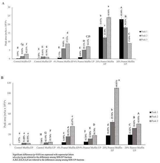 Regarding the extraction carried out using Buffer A (Figure 6A), the control muffins showed a very low percentage related to large polymeric proteins (LPPs, peak 1) for both the SDS-EP and SDS-UP portions, while the highest percentages were registered for peak 3 (LMP + SMP), with 63.21% for SDS-EP, and peak 2 (SPP), with 53.41% for SDS-UP. The muffin samples with the inclusion of 4% roasted peanut flour showed a similar proportion in the protein distribution considering the two fractions (i.e., SDS-EP and SDS-UP), with the highest percentage detected for peak 3 (LMP + SPP), measuring 57.23% and 54.23%, respectively. Moreover, an increase in the LPP peak percentage (peak 1, 6.66%) was highlighted in the SDS-UP fraction. Muffin samples with the inclusion of 20% roasted peanut flour showed the highest percentages for peak 3 (LMP + SMP, 43.95%) in the SDS-EP fraction and peak 1 (LPP, 45.94%) for the SDS-UP fraction, highlighting a marked increase in the extractable polymeric protein (LPP and SPP) forms, especially with the aid of sonication. Three peaks were also recorded using Buffer B, with a protein distribution pushed towards monomeric forms as a consequence of the presence of chaotropic and reducing agents, which contributed to the dissolution of more complex protein structures, releasing lower-molecular-weight proteins (Figure 6, Panel B). A similar protein distribution was registered for the control muffins, which, once again, showed the lowest percentages of large polymeric proteins (LPPs, peak 1). Regarding the 4% peanut muffins, a higher percentage of LPPs was detected than that found in the case of Buffer A (Figure 6, Panel A). A different protein distribution was found for the 20% peanut muffins, where the highest extractability had already been reached in the SDS-EP fraction. This feature suggested the prominence of hydrophobic and covalent reducible linkages and confirmed the extraction of polymeric proteins (LPPs and SPPs), especially with the aid of sonication, since these two percentages were higher in the SDS-UP fraction than the SDS-EP fraction (i.e., 21.02% and 35.02% vs. 10.45% and 25.54%, respectively). Comparing the two buffers, it was found that Buffer B resulted in a significant increase in extractability in the SDS-EP fraction, especially in the case of the peanut muffin samples, while it did not have the same result in the control muffin samples, confirming the results previously shown. For the SDS-UP fraction, however, Buffer B resulted in a significant (p < 0.05) increase in extractability in all the tested samples (with the exception of the control muffin, peak 1), probably as a result of the use of sonication in the extraction procedures. Furthermore, the explanation of the different protein distributions could lie in the proteins’ hierarchical supramolecular architecture that, once broken, generates a form of protein distribution with different proportions. Peanut flour impacted protein network arrangement in a different way, based on the added percentage, achieving the extraction of polymeric proteins with both buffers, but this was strengthened by the combination of the urea and DTT buffer with sonication. The similar behavior obtained for the control muffins and 4% peanut muffins was related to the type of batter obtained, where the eggs’ binding capacities played a major role, affecting the extractability of polymeric proteins, considering that these were then also affected by baking [43]. On the other hand, in the case of the 20% peanut muffins, a completely different structure was found, potentially creating an unextractable nucleus, surrounded by peanut proteins, linked through hydrophobic, disulfide, but also non-reducible bonds, as a result of baking [44,45].