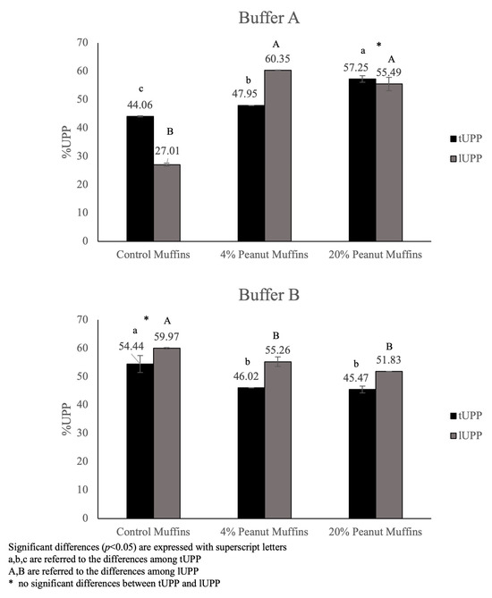 Total (tUPP) and large unextractable polymeric protein (lUPP) percentages of muffin samples obtained with Buffer A and Buffer B.